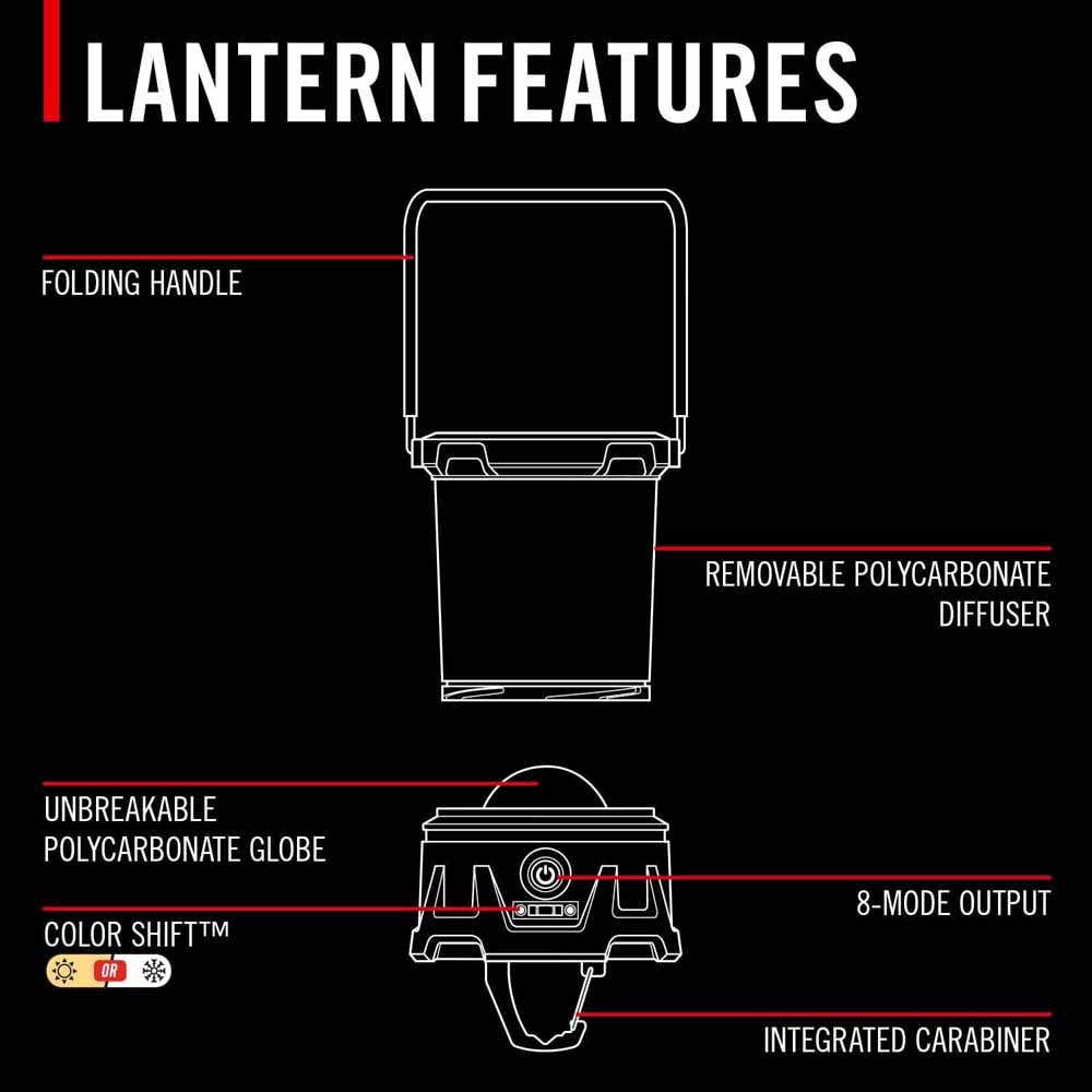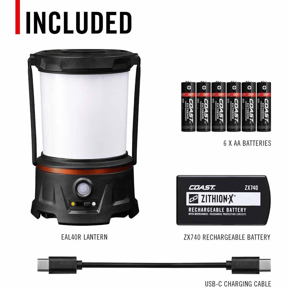 The COAST EAL40R Rechargeable Lantern is a powerful lantern with up to 2500 lumens of brightness. 1 It features Color Shift™ technology to switch between warm and cool light, multiple light modes, and a foldable handle with an integrated carabiner. 1 The Rechargeable Plus system allows for use with the included rechargeable battery or six AA alkaline batteries (sold separately). 1 It includes a USB-C in/out port for charging and powering other devices. 1 The EAL40R is IP54 water-resistant and dust-resistant and backed by a COAST lifetime warranty. 1
