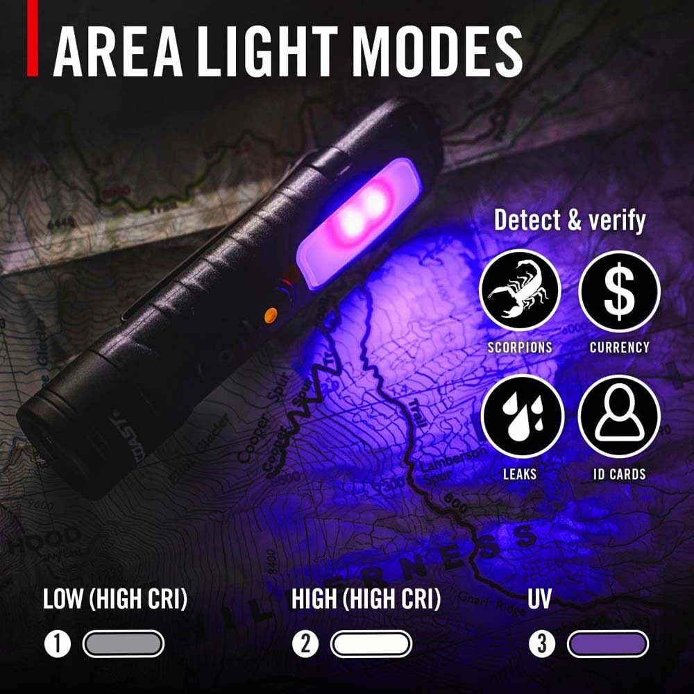 The KL30R USB-C Rechargeable Flashlight is a compact, multi-functional tool that combines a flashlight, headlamp, area light, and UV detection light in one. Powered by a ZITHION™ battery, it delivers up to 16 hours of runtime and offers a 500-lumen MINI™ flood beam with four modes. With a 128-meter beam, true-color high CRI white light, and UV mode for detection tasks, this versatile flashlight is built for any job. Its durable, IP54-rated design includes a two-way pocket clip and lanyard loop, making it perfect for everyday carry. Backed by the COAST lifetime warranty.