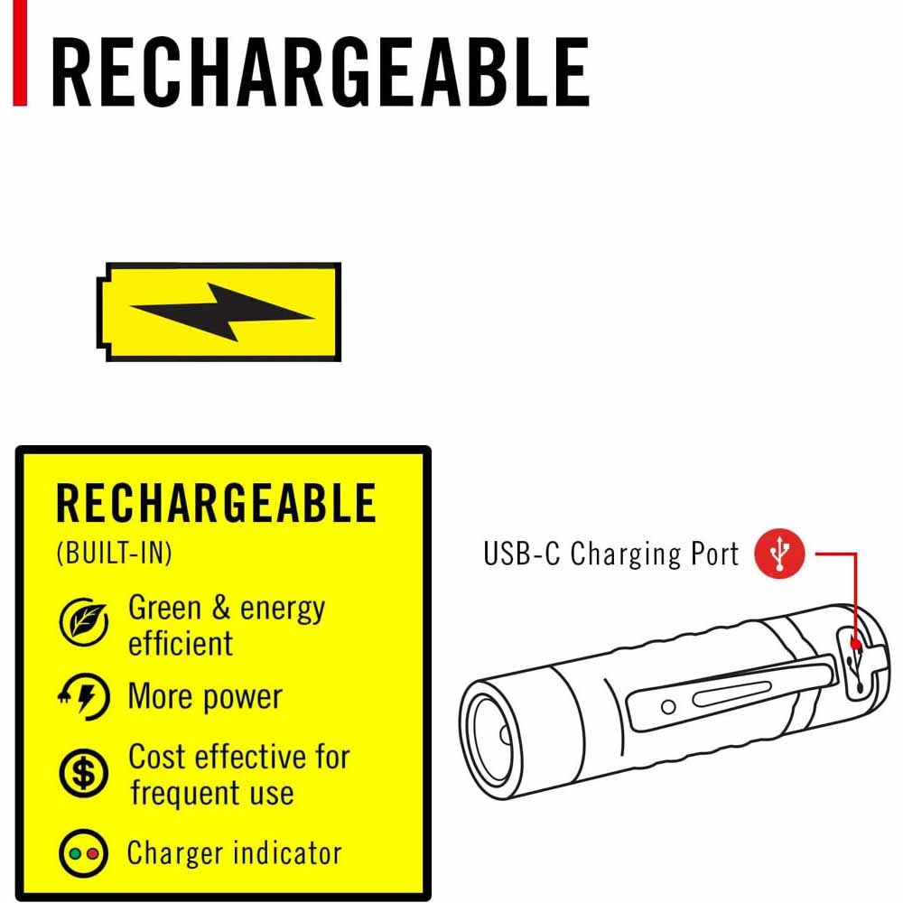 - Built-in USB-C Port: With a built-in USB-C port, your battery can be charged using a USB-C cord. Some COAST models can be charged both inside or outside the light.