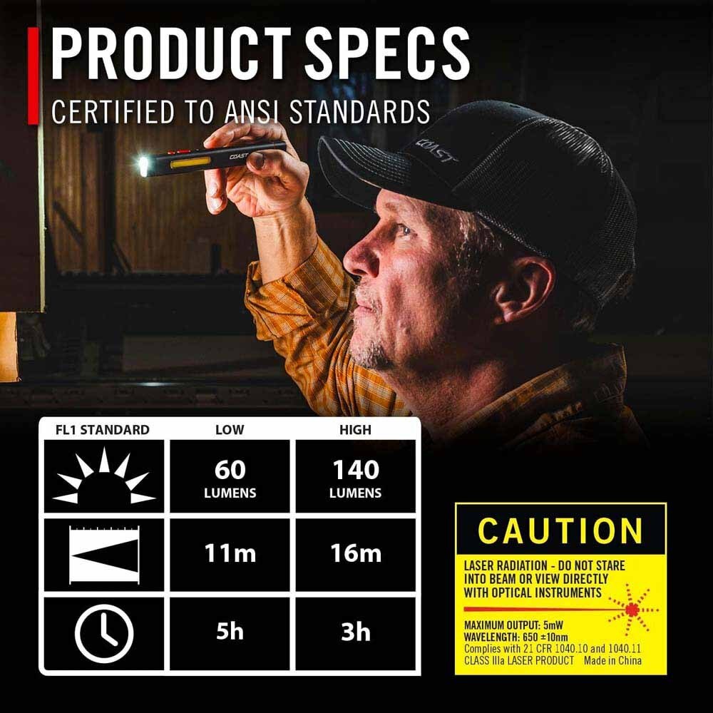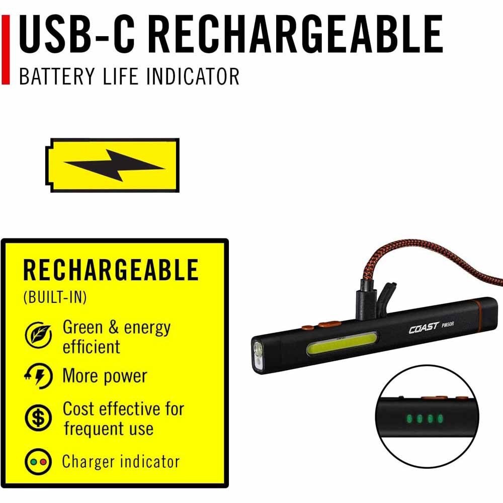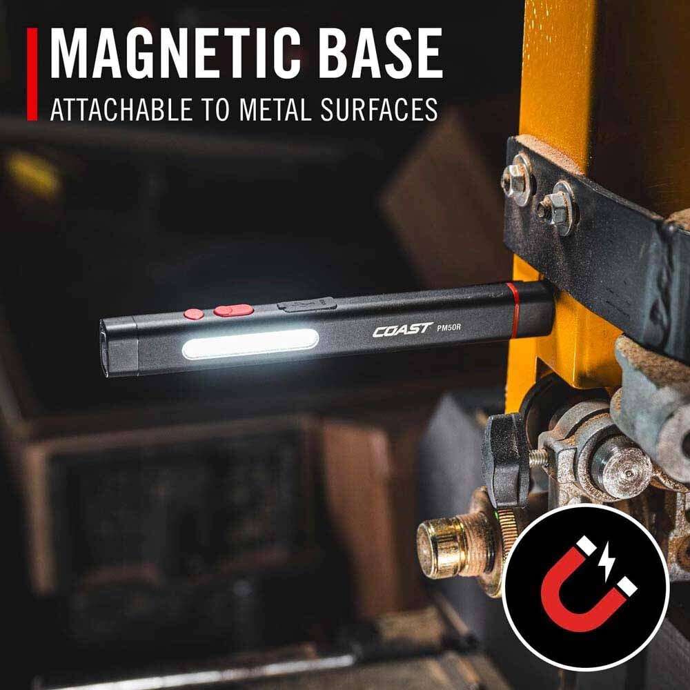 The Coast PM50R Rechargeable Magnetic Dual Beam Work Light offers versatile illumination with a 255-lumen BULLS-EYE™ Spot Beam for long-distance lighting and a C.O.B. side area light for close-up work in White, Red, and Flashing Red. Featuring a front-facing Red LED Laser Pointer, magnetic tail cap, and pocket clip, it provides hands-free positioning for any task. With a 5-hour runtime, real-time battery status, and a durable IP54 rating for dust and water resistance, the PM50R is perfect for tough jobsite conditions.
