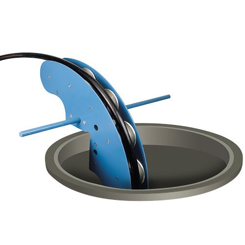 A series of 6 cast aluminum or 6 Nylatron® sheaves on bronze bearings allow cable to make a gradual 90° turn for easy pulling through manhole opening. Pulling radius of 24.25 inches (616 mm). Can also be suspended in manhole to provide alignment to duct run. 4,800 lbs. (21,350 N) cable tension load capacity. Support Bar sold separately. Replacement Sheaves available. See Sheaves Specifications and Selection Charts.