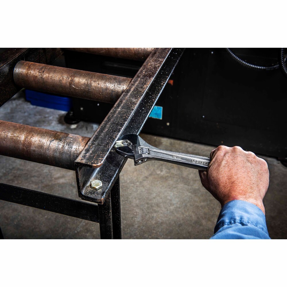 Since the introduction of the original CRESCENT wrench in the early 1900s, the CRESCENT brand has become synonymous with adjustable wrenches. The second generation adjustable wrenches boast a wider knurl for easier adjustment and a laser etched scale on the head providing a quick and convenient way to determine fastener size. Manufactured from alloy steel and then chrome plated to resist rust and corrosion allows the wrenches to be used in professional and industrial Settings, as well as at home. The wide jaw capacity allows each tool to work with more fastener sizes and the wider handle provides better comfort and less stress on the user’s hand. The larger size wrenches, 15 in., 18 in., and 24 in., have tapered handles allowing for a better two-hand grip and less weight.