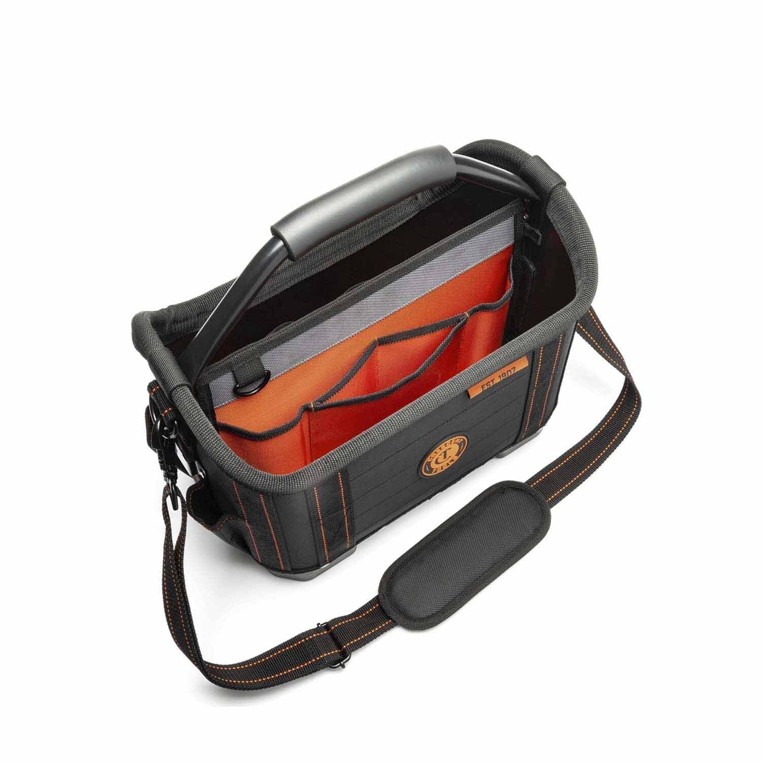Professional-grade 14 inch open-top tool bag with 17 interior and 8 exterior pockets, bright orange interior, and a hard polypropylene moisture-resistant base for durability and organization on the job.