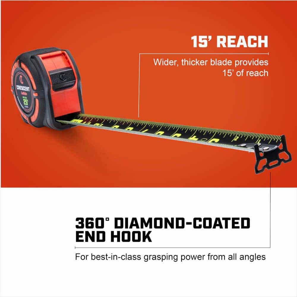The Crescent WORKHORSE 25' Tape Measure features a high contrast, double sided, NITE EYE blade with extra large markings for impressive visibility. The 1-1/4" wide blade and 6" of protective barrrier near the end hook ensures durability and reduces rips and tears. The compact case and easy to access lock button makes using the tape comfortable. Its 360-degree end hook and 15 feet of reach makes solo jobs simple.