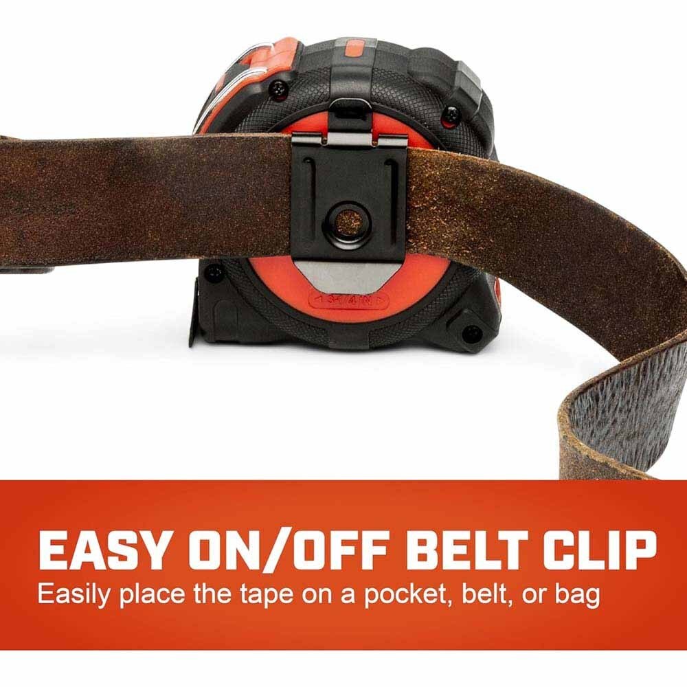 - Easy on/off deep pocket belt clip secures the tape to the pocket or belt when not in use