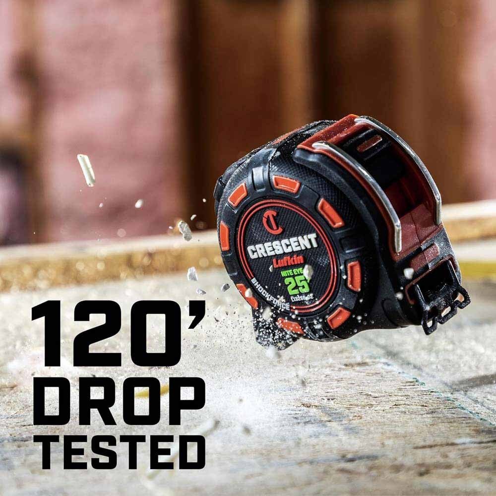 The Crescent SHOCKFORCE tape measures features a high-contrast tri-color NITE EYE blade for market-leading visibility, even in low light conditions. The all-new STABLEWING blade shape provides 16ft of stable reach, reduced blade roll-over, and a flatter profile for easier marking. The 3X clear-coated blade and mylar coating on the first 6 inches provides protection against wear and tear. These features are housed in an impact-resistant case that has been drop-tested 120 feet to withstand even the toughest of jobsite conditions.