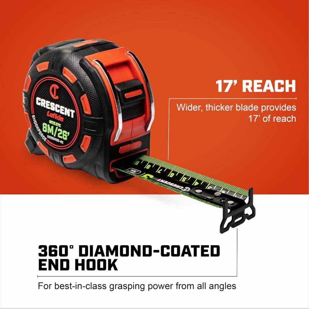 The Crescent SHOCKFORCE tape measures features a high-contrast tri-color NITE EYE blade for market-leading visibility, even in low light conditions. The all-new STABLEWING blade shape provides 16ft of stable reach, reduced blade roll-over, and a flatter profile for easier marking. The 3X clear-coated blade and mylar coating on the first 6 inches provides protection against wear and tear. These features are housed in an impact-resistant case that has been drop-tested 120 feet to withstand even the toughest of jobsite conditions.