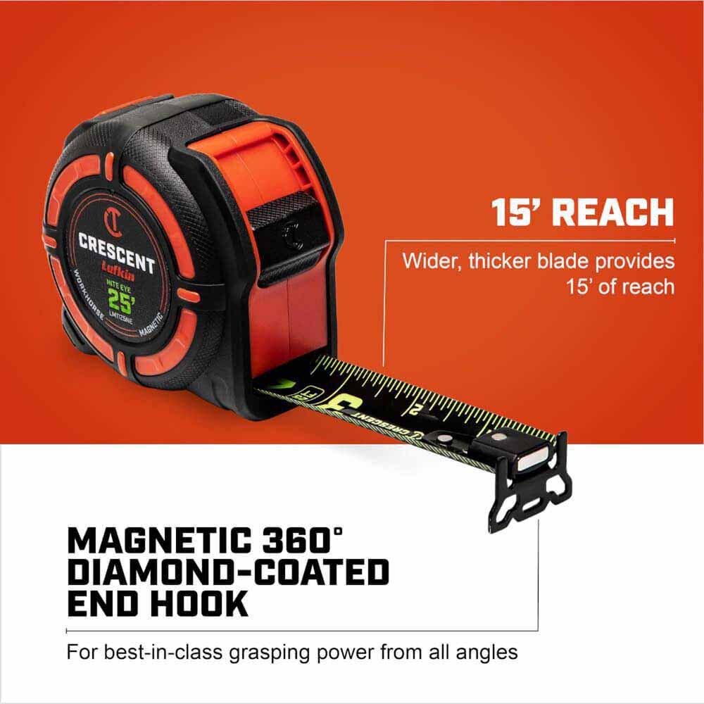 The Crescent WORKHORSE 25' Tape Measure features a high contrast, double sided, NITE EYE blade with extra large markings for impressive visibility. The 1-1/4" wide blade and 6" of protective barrrier near the end hook ensures durability and reduces rips and tears. The compact case and easy to access lock button makes using the tape comfortable. Its magnetic 360-degree end hook and 15 feet of reach makes solo jobs simple.
