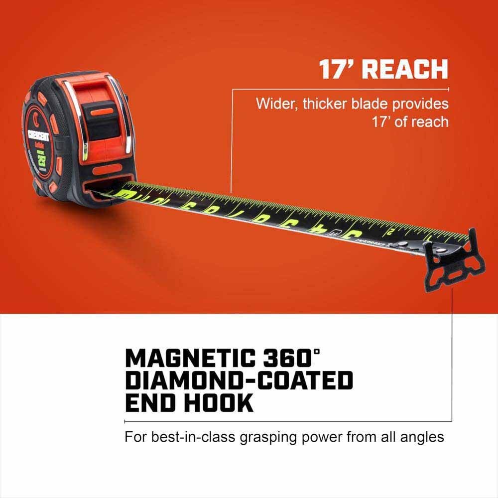 The Crescent SHOCKFORCE tape measures features a high-contrast tri-color NITE EYE blade for market-leading visibility, even in low light conditions. The all-new STABLEWING blade shape provides 16ft of stable reach, reduced blade roll-over, and a flatter profile for easier marking. The 3X clear-coated blade and mylar coating on the first 6 inches provides protection against wear and tear. These features are housed in an impact-resistant case that has been drop-tested 120 feet to withstand even the toughest of jobsite conditions.