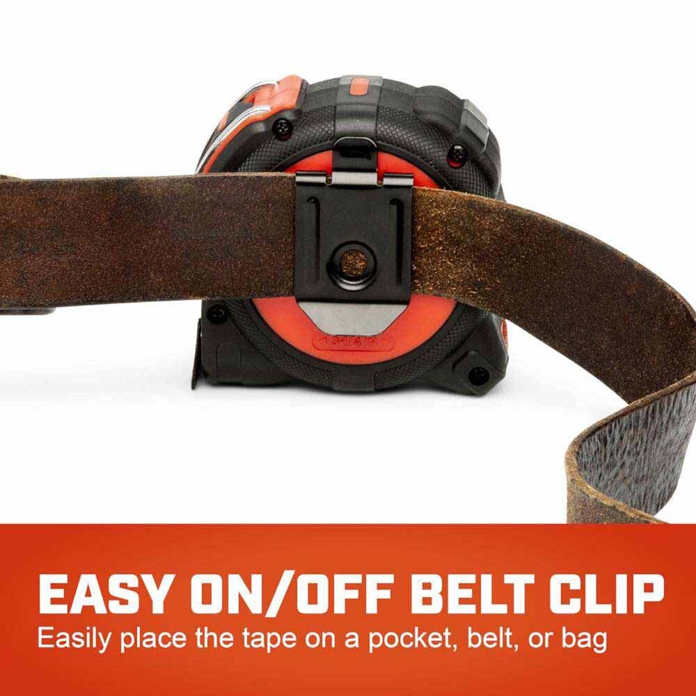 - Easy on/off deep pocket belt clip secures the tape to the pocket or belt when not in use
