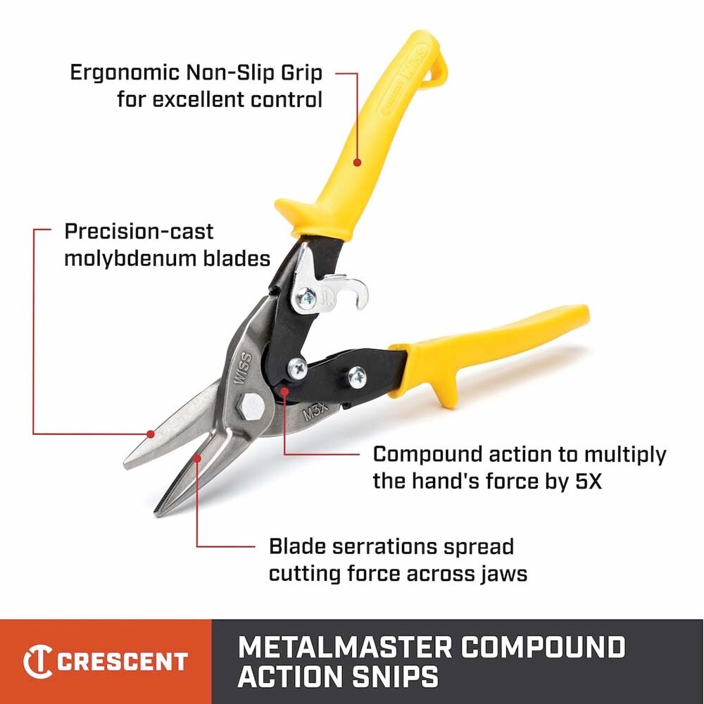 Crescent Wiss® has taken the Aviation Snip to the next level with the advanced MetalMaster® Aviation Snips. The precision-cast molybdenum blades have CNC-ground serrations which allow for more uniform serrations that provide a cleaner cut every time. They feature extended pivot bolt life due to the superior free-float design. The spring-action design allows for fast, effortless feed. The all-new latch design provides ergonomic single-handed operation for left or right handed users. New extended non-slip handle grips give users better control while cutting. The new generation of Crescent Wiss MetalMaster® will cut over 8 miles of steel and feature up to 10 times longer cut life than traditional Aviation Snips. They are available in left/straight cut, right/straight cut, and straight cut.