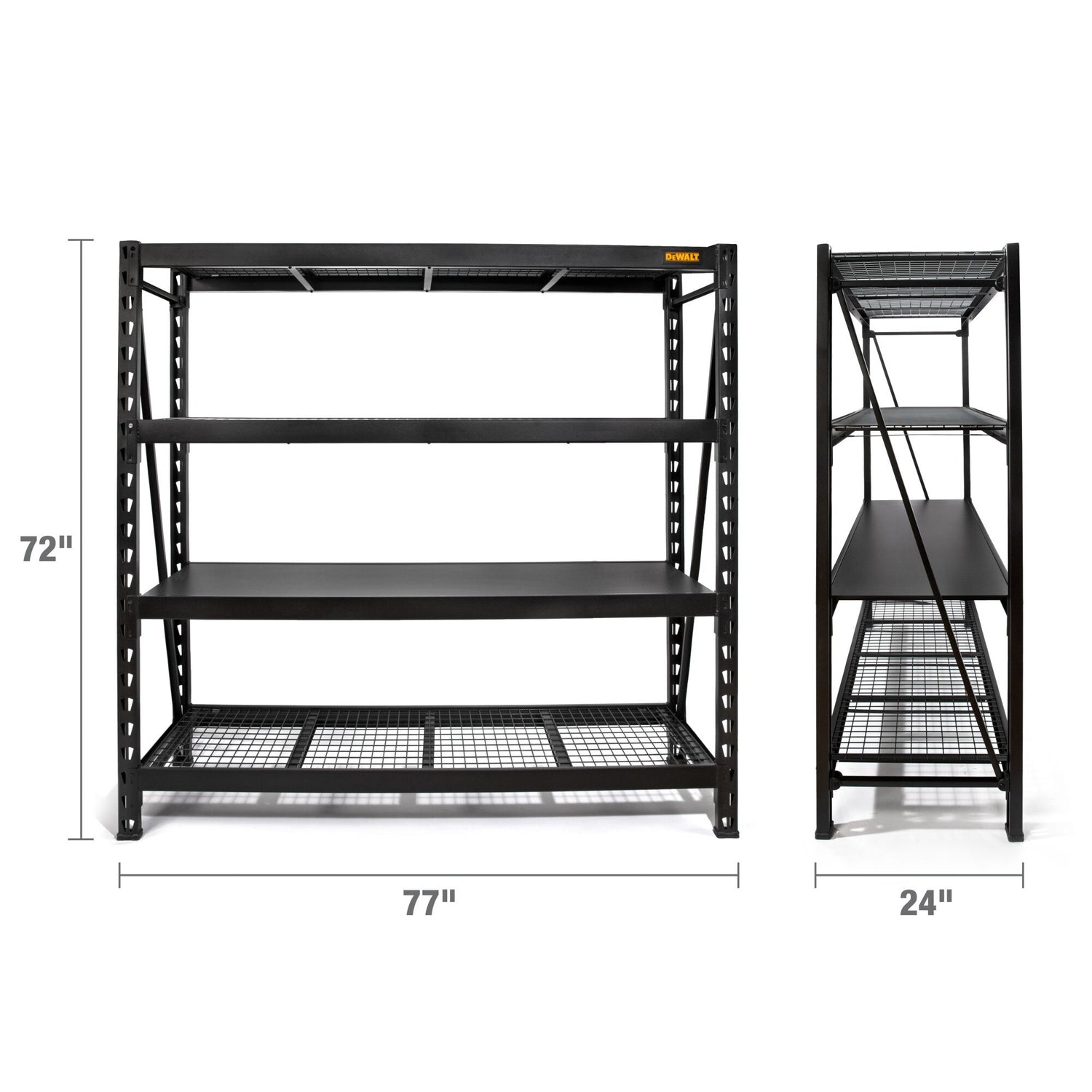 The DEWALT DXST10000BLK 6-Foot Tall, 4 Shelf Industrial Rack was designed and engineered to provide heavy-duty, professional level storage. This rack features innovative details that aren't typically found on industrial racks such as dense wire grids that prevent items from falling through, safety straps with weld nuts for ease of assembly, and top caps that protect both you and your items from possible damage. The three industrial metal wire grid and one black laminate wood composite deck can each support an evenly distributed 2,500 lb. for a total of 10,000 lb. The uprights, crossbeams, and support straps are all made from powder-coated steel and are designed so that once assembled, each shelf has two types of support straps in addition to the crossbeams to prevent them from buckling under pressure. The shelves are adjustable in 3 inch increments and the locking pins ensure that each shelf is properly installed. Glass-filled nylon feet on the uprights protect the powder coat from damage when repositioning the rack in addition to providing a second layer of protection against unwanted moisture and liquid spills and protecting finished flooring from damage. Additional safety features include locking grid clips to secure the wire grids into place and a wall mount bracket so you can secure your rack in place to prevent any accidental tipping. For easy assembly, the rack hardware kit includes a wrench, hex key, and hex driver bit and two of the four uprights come with pre-installed horizontal and diagonal support beams making getting started fast and stress-free.