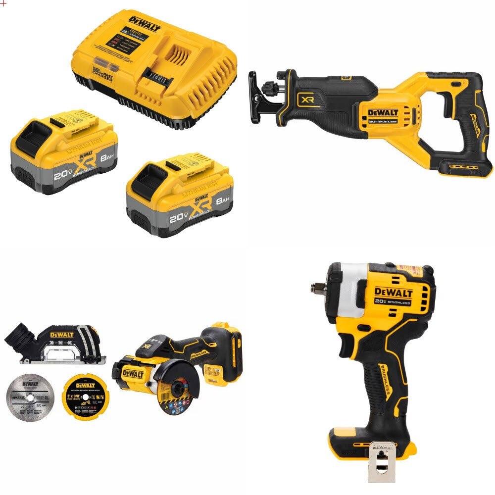 Power your 20V MAX lineup with this DeWalt kit pairing an XR 8Ah Starter Kit with three pro-grade tools for cutting and fastening. The high-capacity batteries and fast charger keep you working while the brushless reciprocating saw delivers fast, controlled demolition and remodeling cuts. Tackle metal, tile, plastics, and more with the compact 3 in. cut-off tool, then handle bolts and lugs with the compact 3/8 in. impact wrench. Ideal for contractors and serious DIYers needing runtime, versatility, and portability across jobsites.