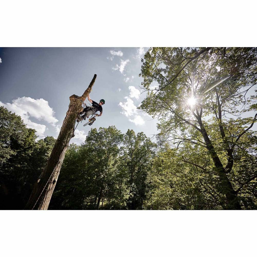 Built for the experienced tree professional, the 60V MAX* 14 in. Top Handle Chainsaw uses advanced FLEXVOLT® batteries to maximize power without the hassles of gas. Cut through an 11 in. log up to 35% faster than a 35cc gas chainsaw‡ with up to 2.4 HP and a chain speed of 23 m/s. Engineered to deliver optimal maneuverability while operating in difficult areas, this saw is ideal for tree pruning and removal. Powered by FLEXVOLT® batteries, this saw has the capacity to make 160 cuts per charge on 4x4 pressure-treated pine†. Equipped with an adjustable oiler, D-ring harness attachment point, tooled tensioning, inertia chain brake, metal bucking spikes, and an LED dashboard, this 60V MAX* 14 in. Top Handle Chainsaw is designed to charge through demanding jobs.