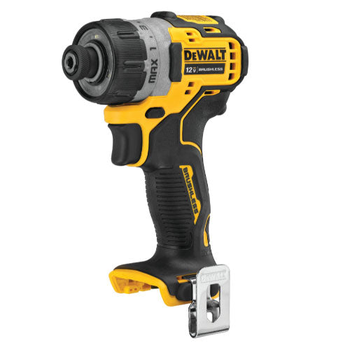 The DEWALT XTREME 12V MAX Brushless 1/4" Cordless Screwdriver (Tool Only) (DCF601B) is compact and performance packed. This 12V MAX screwdriver is designed for hard to reach fastening applications that need the control of a clutch. At only 4.8 inches long it is packed to perform with 200 UWO of power. It also features 3 LED lights positioned on the nosecone to illuminate work areas.
