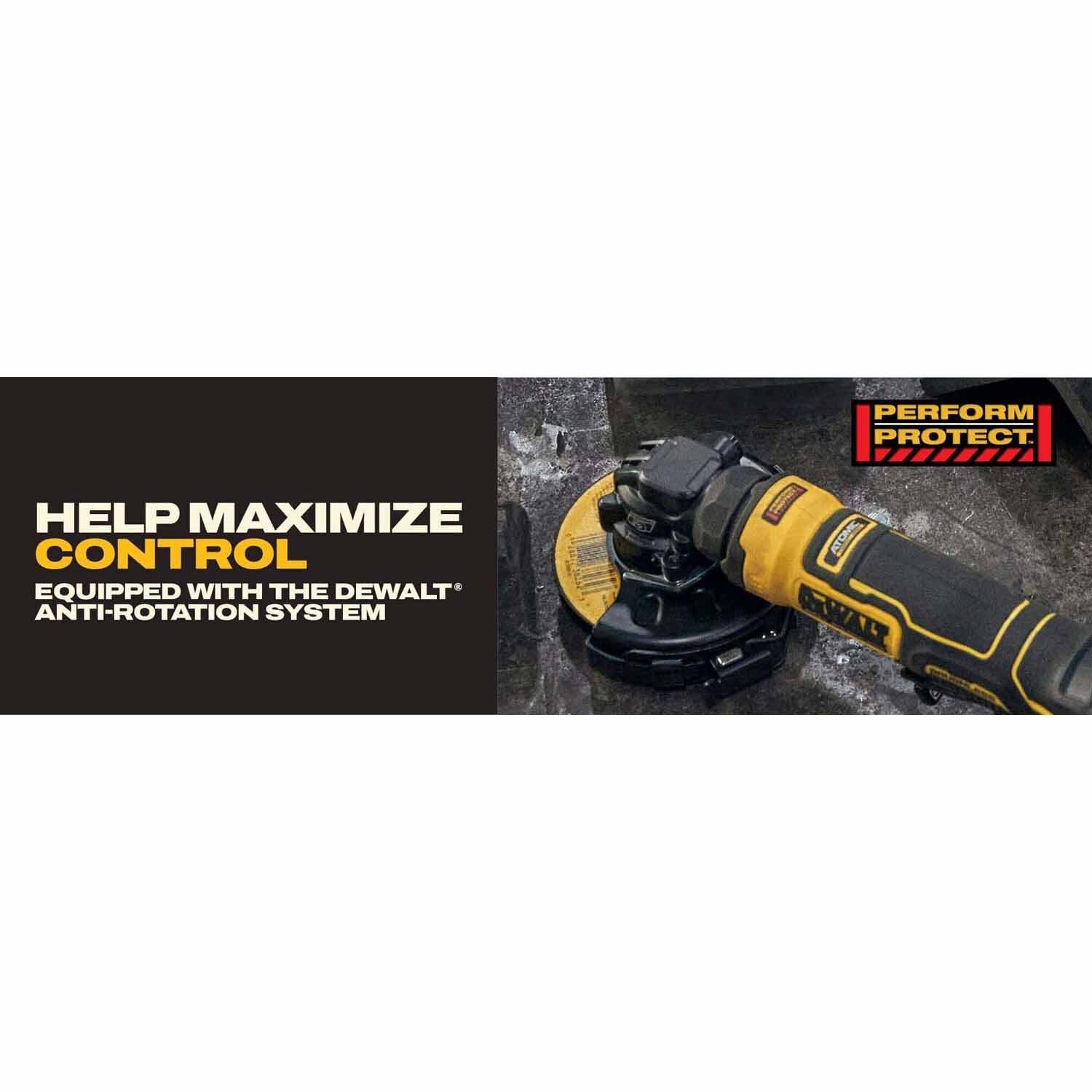 - Help maximize control - equipped with the dewalt anti-rotation system. this feature quickly stops the wheel when a pinch, stall, or bind-up event is sensed, reducing reactionary torque. the switch needs to be cycled (turned on and off) to restart the tool.