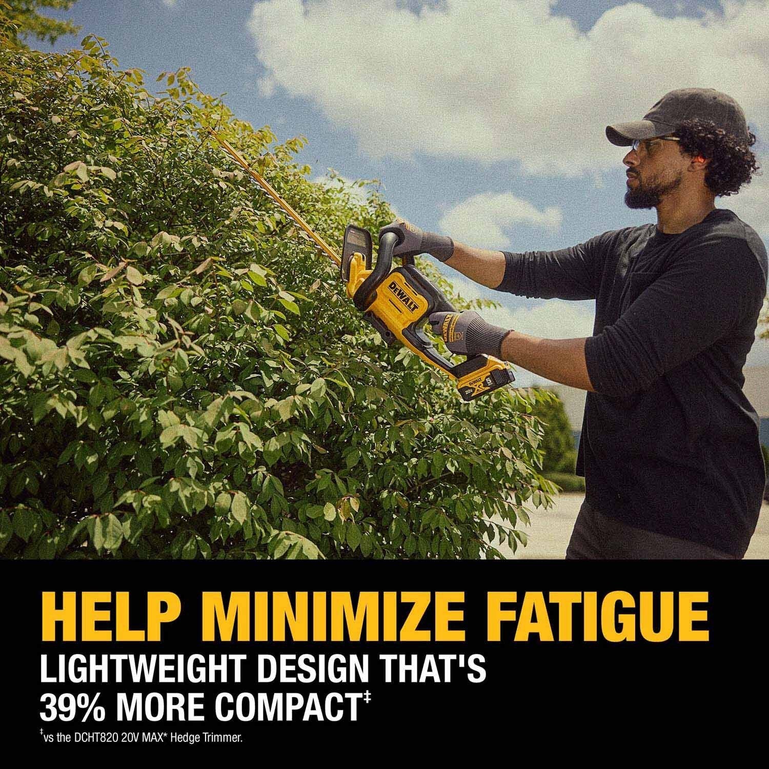 Tackle tough branches and overgrowth with the 20V MAX 22 in. Hedge Trimmer Kit. A high output motor is designed to tackle branches up to 3/4 in. thick and deliver up to 78 minutes of runtime†. Make clean, fast cuts with laser-cut, 22 in. hooked tooth blades. Help protect the transmission with a friction clutch that engages if obstacles are hit during use. A lightweight design that's 39% more compact‡ maximizes maneuverability and minimizes stress on your arms. This hedge trimmer is compatible with a hedge sweep (DCZHT800 sold separately) designed to collect hedge clippings and keep bushes clean. Powered by the included 20V MAX* battery, this hedge trimmer kit offers compact convenience and professional versatility.