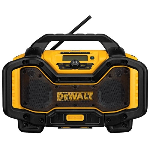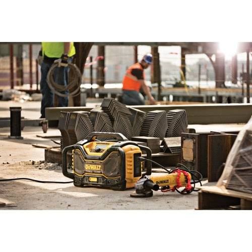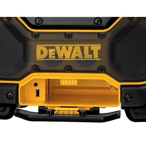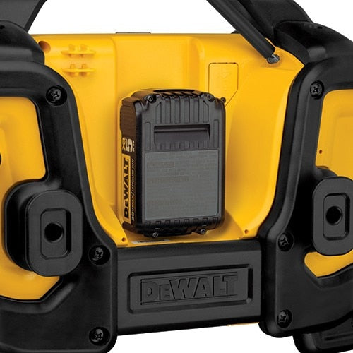 The DCR025 is designed to be the most versatile Jobsite Radio Charger on the market. The unit is able to run off and charge all DEWALT slide pack battery packs including 20V and FLEXVOLT packs at 3 AMPs when plugged into an AC outlet. The unit is designed to include woofers, tweeters and air ports to provide clear and rich sound at all volume levels. An over sized device storage box protects devices from worksite conditions and includes an Aux and 2.1 AMP USB charging port for convenient device charging. 2 AC Power outlets on the side of the unit allows you to plug in additional tools or chargers without occupying additional outlets on the wall. AVRCP (Audio Visual Remote Control Protocol) allows you to control your device from the radio interface so you can keep the device in a safe place and skip to the next song or hit replay on the radio interface.