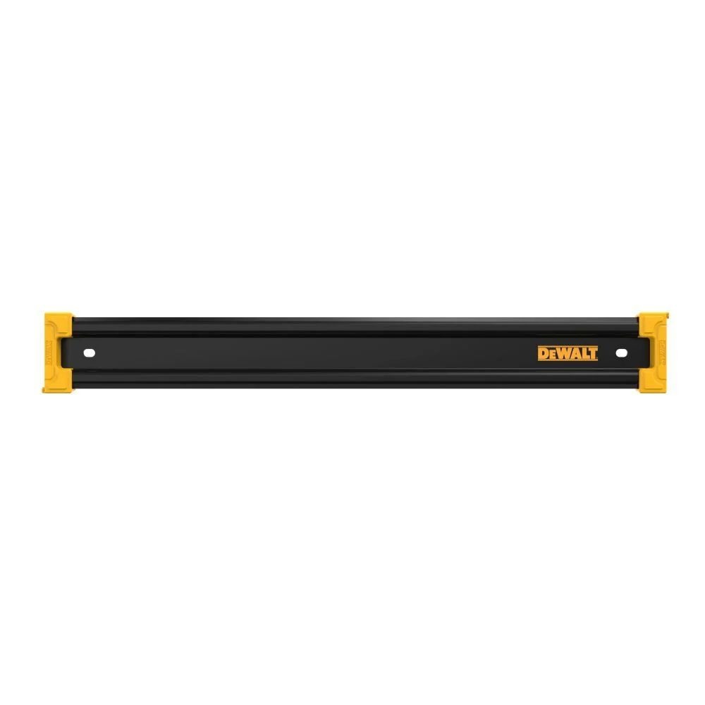The DEWALT 20in Metal rail is designed for installation on DEWALT Workbench legs or on DEWALT Welded Floor Cabinet sides with nutserts built in. It is constructed of heavy-duty steel for durability that can support up to 50 lbs when installed on DEWALT Workbenches and up to 30 lbs when installed on DEWALT Welded Floor Cabinet sides. In includes two endcap joiners that provide a finished look. It accepts DEWALT Workshop Storage Sytem Accessories to help create a customized organization solution for an integrated storage system. The patented latching system secures DEWALT workshop Accessories directly to the rail.