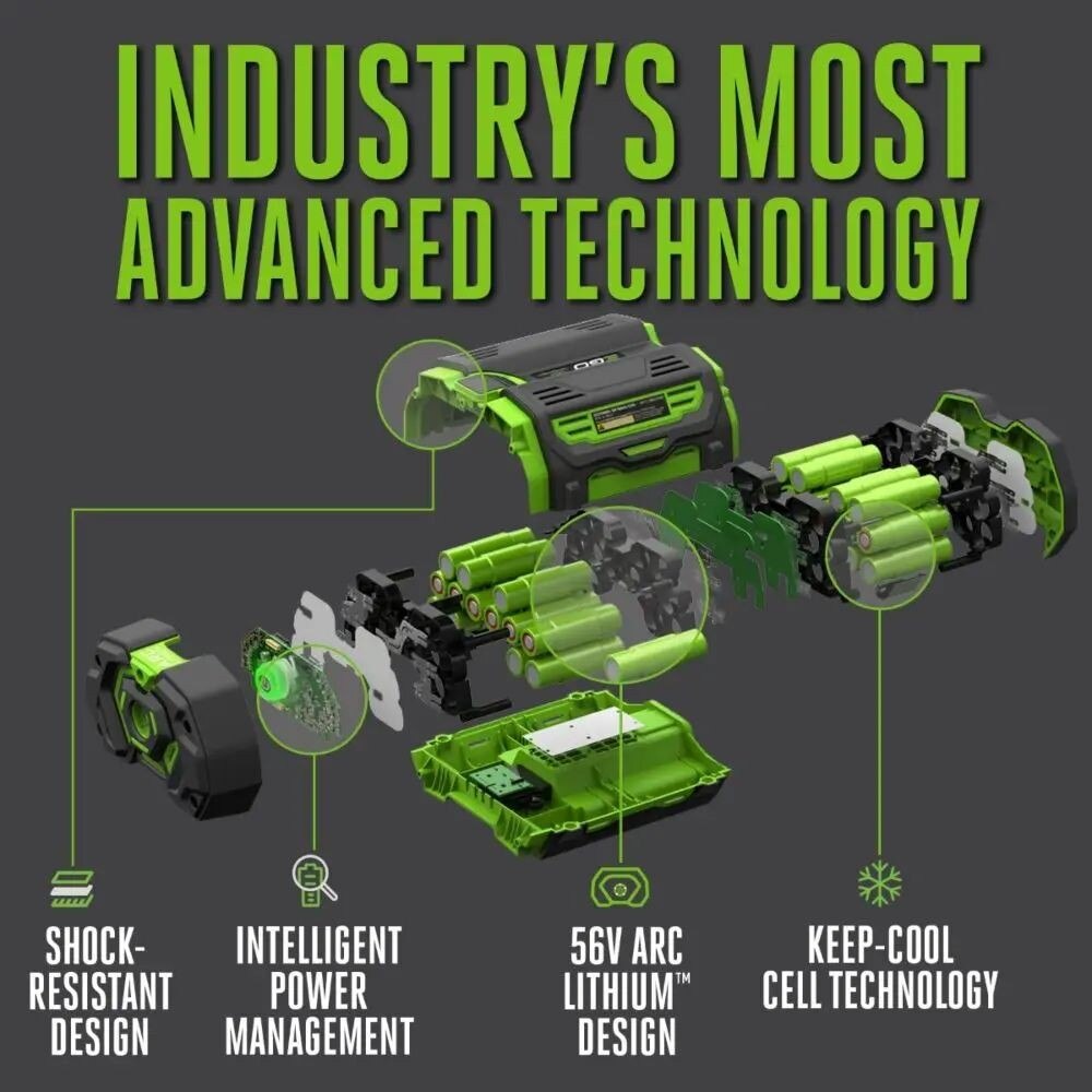 The EGO 56V 4.0Ah ARC Lithium™ Battery uses industry-leading technology to deliver Power Beyond Belief™. Its patented ARC Lithium™ design keeps the battery from overheating by pushing heat away so your equipment runs longer at full power. Its durable, shock-resistant design protects batteries from drops and the elements. Intelligent power management monitors and optimizes each individual battery cell to maximize power, performance, and runtime. This 4.0Ah battery features a fuel gauge with built-in indicator lights that show how much runtime is remaining in 20 percent increments. The 4.0Ah battery fully charges in 30 minutes with the EGO POWER+ Turbo Charger (CH7000), 30 minutes with the Rapid Charger (CH5500), 55 minutes with the 320W Charger (CH3200), and 80 minutes with the Standard Charger (CH2100). Two 4.0Ah batteries will fully charge in 60 minutes with the EGO Power+ Dual-Port Charger (CH2800D). With the industry’s most advanced battery technology, every EGO tool delivers or exceeds the power and performance of gas without the noise, fuss, or fumes.
