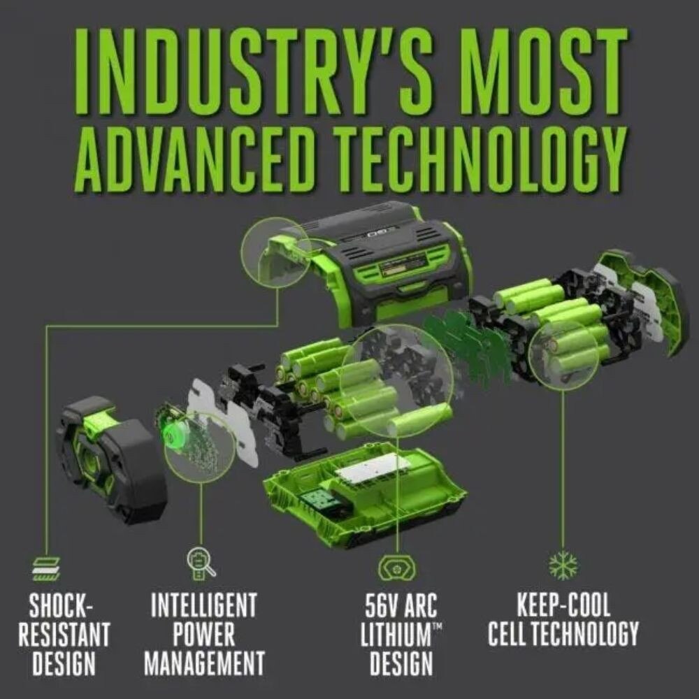 The EGO 56V 12.0Ah ARC Lithium™ Battery uses industry-leading technology to deliver Power Beyond Belief™. Its patented ARC Lithium™ design keeps the battery from overheating by pushing heat away so your equipment runs longer at full power. Its durable, shock-resistant design protects batteries from drops and the elements. Intelligent power management monitors and optimizes each individual battery cell to maximize power, performance, and runtime. This 12.0Ah battery features a fuel gauge with built-in indicator lights that show how much runtime is remaining in 20 percent increments. The 12.0Ah battery fully charges in 75 minutes with the EGO POWER+ Turbo Charger (CH7000), 90 minutes with the Rapid Charger (CH5500), 160 minutes with the 320W Charger (CH3200), and 230 minutes with the Standard Charger (CH2100). Two 12.0Ah batteries will fully charge in 180 minutes with the EGO Power+ Dual-Port Charger (CH2800D). With the industry’s most advanced battery technology, every EGO tool delivers or exceeds the power and performance of gas without the noise, fuss, or fumes.