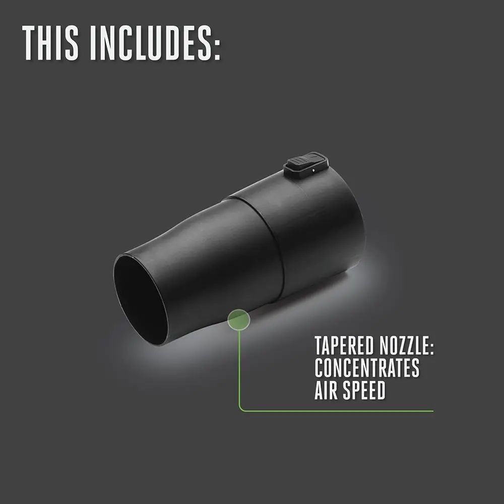 The EGO POWER+ 615 CFM Blower delivers airspeeds up to 615 CFM and 170 MPH to power through wet leaves, grass, and other heavy debris. This cordless leaf blower delivers up to 75 minutes of average runtime on a single charge with the recommended 56V 2.5Ah ARC Lithium™ battery (available separately). Its variable speed dial with lock-on button allows you to adjust your airspeed from 200 to 480 CFM for ultimate control. Activate turbo mode to power through heavy debris with 615 CFM. This leaf blower features a high-efficiency brushless motor that delivers long runtimes, low vibrations, and an extended motor life. Turbine fan engineering, inspired by advanced aeronautics technology, performs better than premium gas leaf blowers. The included tapered nozzle makes clearing debris in all conditions easy, and IPX4 weather-resistant construction delivers protection from the elements. This quiet, lightweight, and compact electric leaf blower gets the job done faster and quieter than gas. Experience Power Beyond Belief™ without the noise, fuss, or fumes.