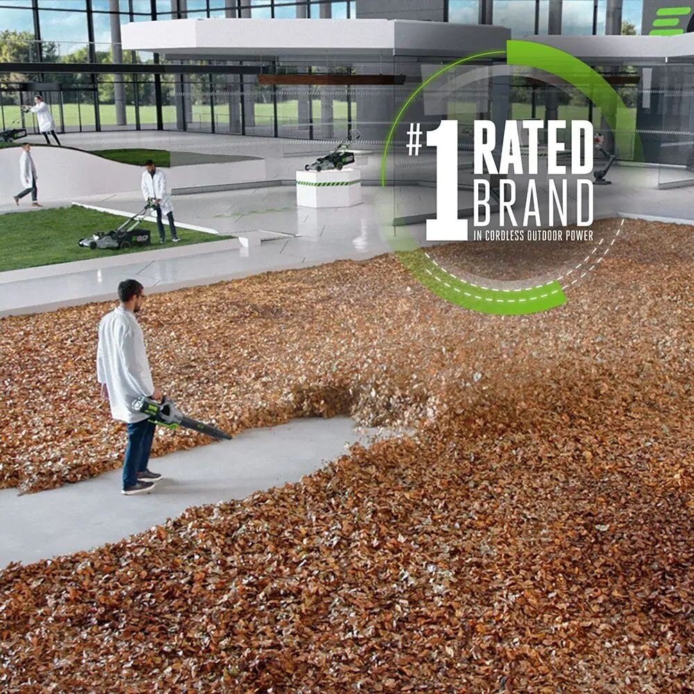 The EGO POWER+ 670 CFM Blower delivers air speeds up to 180 MPH and 670 CFM to power through wet leaves, caked on grass, rocks, and other heavy debris. This cordless leaf blower delivers up to 80 minutes of runtime on a single charge with the included 56V 4.0Ah ARC Lithium™ battery. Its speed control dial allows you to adjust your airspeed from 250 to 530 CFM for ultimate control. Activate turbo mode to power through heavy debris with 670 CFM and 21N push force. The variable speed trigger includes a cruise control dial for consistent blowing. This leaf blower features a high-efficiency brushless motor that delivers long runtimes, low vibrations, and an extended motor life. Turbine fan engineering, inspired by advanced aeronautics technology, performs better than premium gas leaf blowers. The included tapered and spread nozzles make clearing debris in all conditions easy, and IPX4 weather-resistant construction delivers protection from the elements. This quiet, lightweight, and compact electric leaf blower gets the job done faster and quieter than gas. Experience Power Beyond Belief™ without the noise, fuss, or fumes.