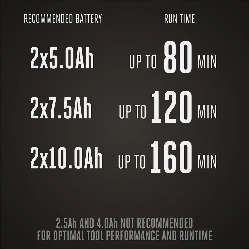 • Up to 80 minutes of runtime on a single charge with two included 56V 5.0Ah ARC Lithium™ batteries