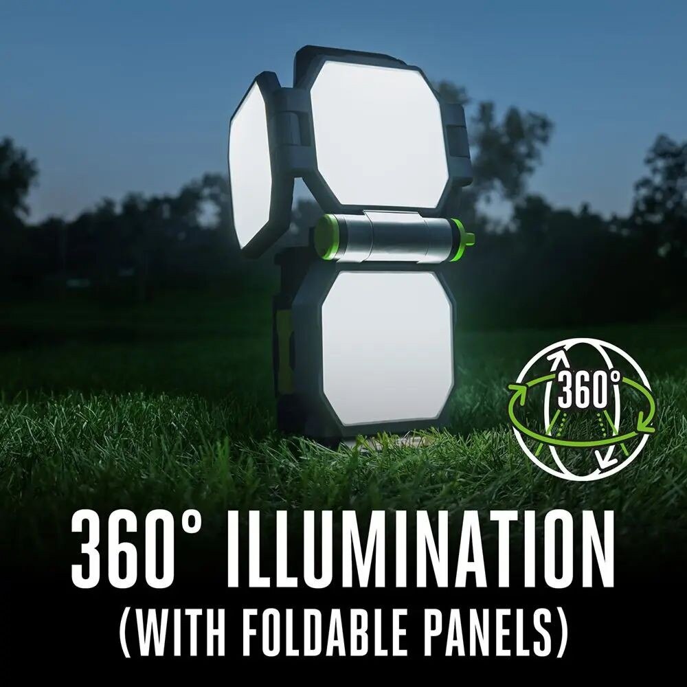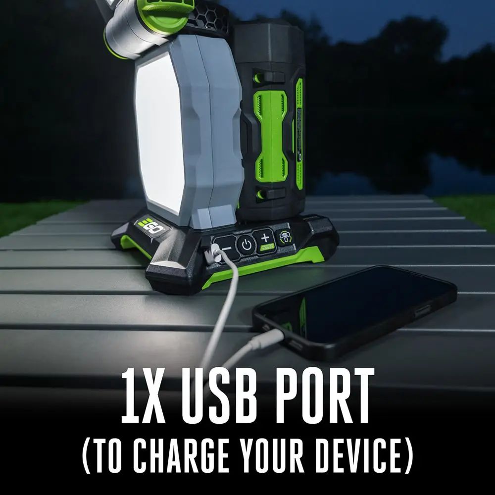 Introducing the EGO POWER+ Portable Area Light, the world’s most powerful area light in handheld cordless outdoor power. Illuminate any environment with 5 different brightness settings adjustable from 600-10,000 lumens.The POWER+ Portable Area light can be used as an ambient mood light, effective task light, and so much more. Activate boost mode for best in the class 10,000 lumens to illuminate large areas. With its compact design and integrated handle, easily store this light or take it on the go! Ideal for indoor and outdoor conditions with diffused panels for a softer light and weather resistant construction.This light is equipped with rafter hooks for hanging overhead and a tripod mount to cast light over an entire room. Get up to 35 hours of run time(on low with the recommended 5.0Ah ARC Lithium™ battery, available separately). Premium features like a USB A-Port come standard to make the experience unlike any other, allowing you to power or charge essential devices. Compatible with all EGO POWER+ ARC Lithium™ batteries (available separately) to deliver Power Beyond Belief™.
