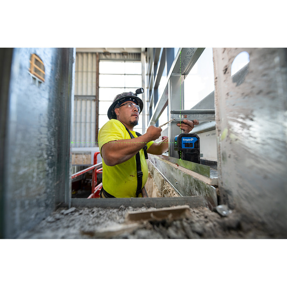 The Empire Green Self-Leveling 3-Point Laser provides a bright, durable, and compact, alkaline powered laser level solution that can assist in a variety of layout applications. With a working range of up to 125’, the bright green laser provides pronounced visibility when working with the laser level, even in well-lit conditions. This green laser level is powered by (4) AA Alkaline batteries for up to 30+ hours of continuous runtime, allowing for less downtime versus competitive alkaline laser solutions. The laser has a locking pendulum and rugged over-molded housing, allowing it to withstand impact if dropped and maintain proper calibration. This 3 point laser level also features powerful rare earth magnets that aid the user when splitting the beam over a steel track. The Green Self-Leveling 3-Point Laser (eLG3D) comes with a 1 Year Limited Lifetime Warranty.