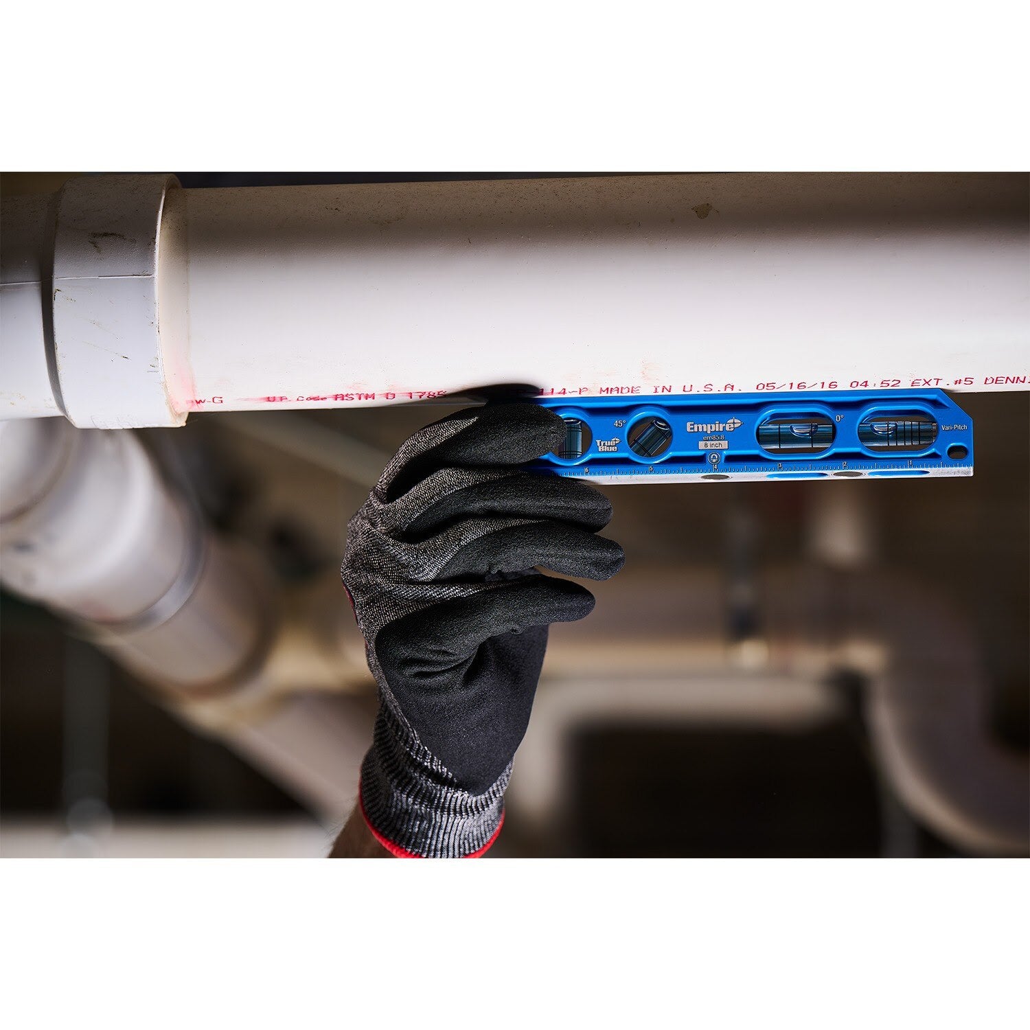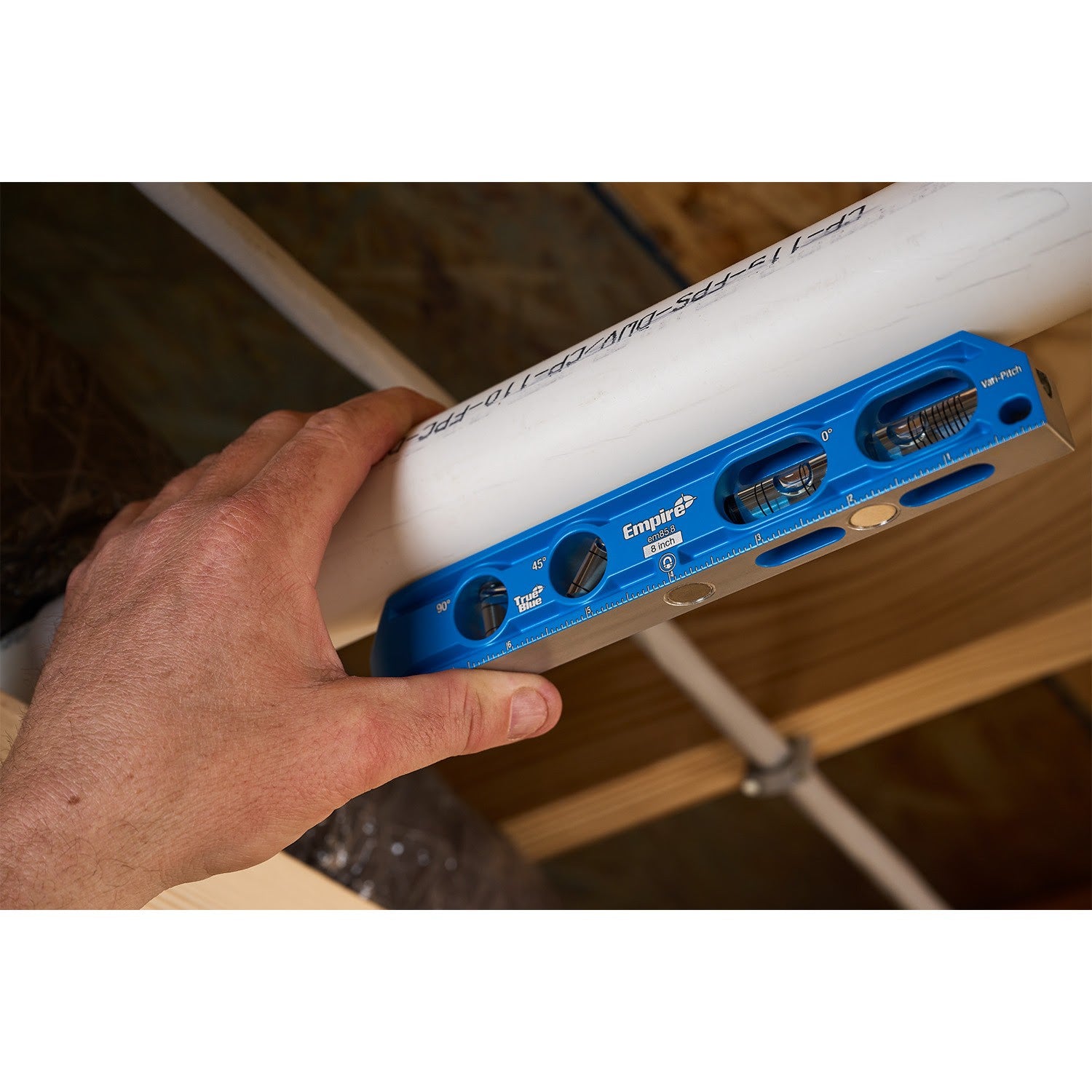 The Empire 8” TRUE BLUE Die Cast Torpedo Level features a VARI-PITCH vial that reads slope at 1/8”, ¼”, 3/8”, and ½” as well as vials with display angles of 0°, 45°, and 90°. Its powerful rare earth magnets provide superior holding strength, and it has an aluminum frame that provides strength and durability. This level also features a V-Groove working edge that fits on pipe and conduit.
