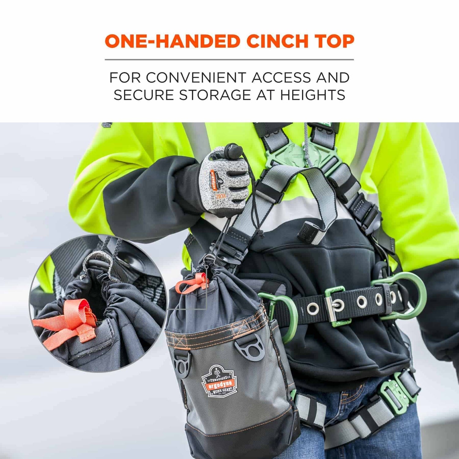 - ONE-HANDED CINCH TOP – Drawstring closure for convenient access and secure storage of tools while at heights