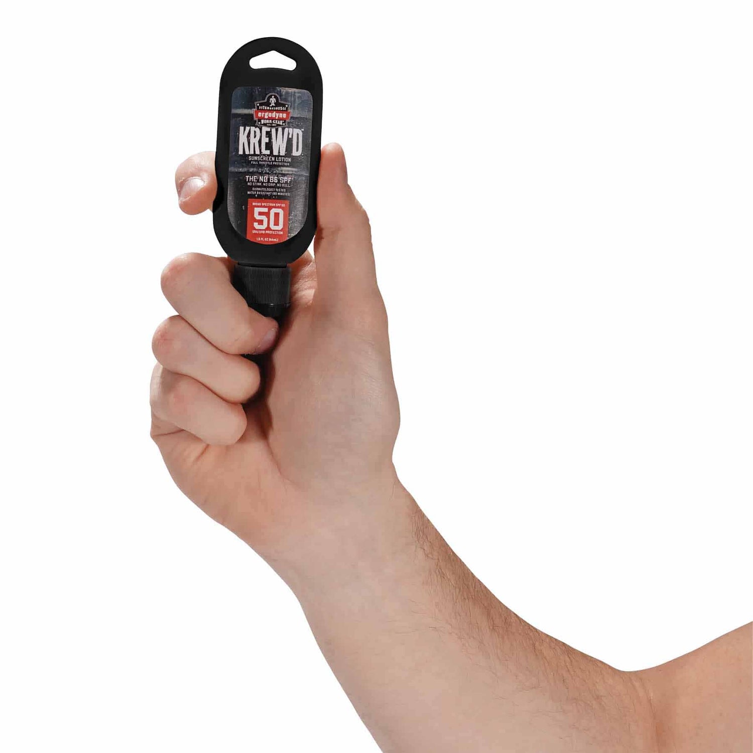 The KREW'd 6352 SPF 50 Sunscreen Lotion (1.5oz bottle) provides safe and effective broad-spectrum UVA/UVB protection against sunburn. It's a water-resistant and sweat-resistant sunscreen for 80 minutes. This FDA approved sunscreen comes in a 1.5oz squeeze bottle with a connection point for an optional hang cord or carabiner to attach to belt loops, backpacks, keys, etc. The 50 SPF offers protection against both UVA and UVB rays, which can cause skin cancer. KREW'd is a water-resistant sport formula that provides even coverage for better protection. It's lightweight, non-greasy, absorbs quickly and is free of paraben/phthalates and octinoxate/oxybenzone. Slather. Work. Repeat. Skin damage can occur all year round from sun exposure. Sunblock should be applied evenly & thoroughly on exposed skin. We recommend applying liberally 15 minutes before you go into the sun to allow the sunscreen to fully bind to the skin. Reapply every 2 hours, or as needed.