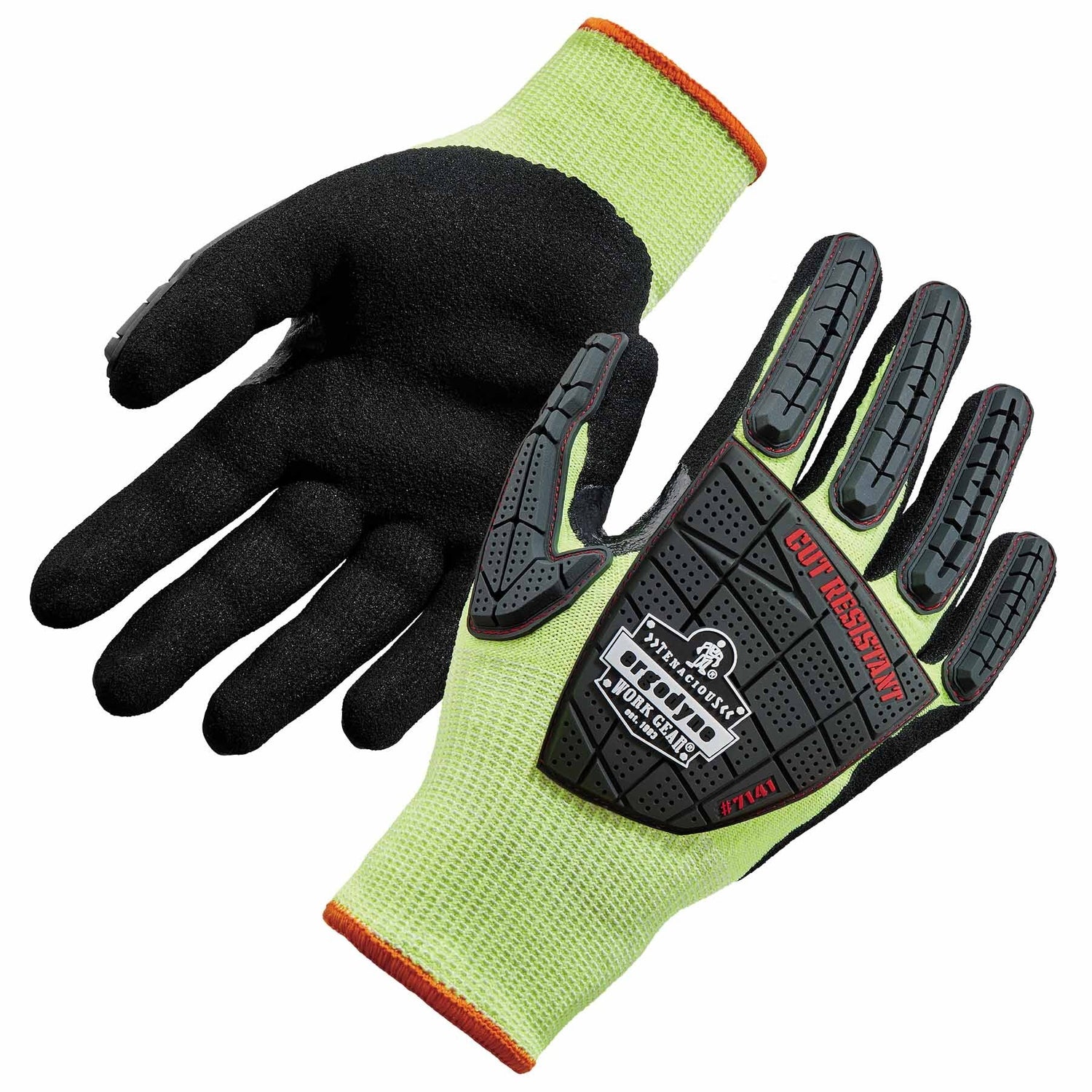 The ProFlex 7141 Hi-Vis Nitrile-Coated DIR Level 4 Cut-Resistant Gloves are designed with two new technologies to create the most comfortable, breathable and best gripping ANSI cut level 4 gloves on the market. Also, featuring molded TPR Armor on the knuckles and fingers for superb dorsal impact protection (DIR). This knit work glove is made with high-performance polyethylene (HPPE) fibers for superior A4 cut protection. HPPE doesnt include steel or glass often used in other anti-cut gloves which can cause irritation. The WSX dip combined with TenaLux yarn make these palm-coated gloves cool to the touch with 360-degrees of breathability. The liquid-resistant special coating absorbs and wicks moisture from the surface making these firm-grip gloves stand out especially in wet oily and wet conditions. The water-based polyurethane (PU) coating combined with nitrile dip allows maximum dexterity and significantly relieves hand fatigue while ensuring durability.
