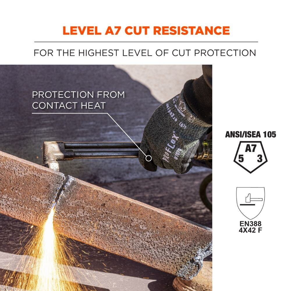 CASE PACK - INCLUDES 12 PAIRS The ProFlex 7070 Nitrile Coated Cut-Resistant Gloves are made with heavy-duty aramid fiber for heat handling and ANSI A7 cut resistance, plus durable sandy nitrile coated palms for high strength grip and enhanced dexterity. The form-fitting 13-gauge aramid fiber knit protects hands from heat and cuts without compromising flexibility or comfort. The snug knit cuffs are longer than most on the market, a feature that enhances fit and extends protection while keeping dirt and debris out. EN407 LEVEL 1 CONTACT HEAT RESISTANCE These safety work gloves are tested to EN407 level 1 contact heat resistance for safety when handling high temperature materials. A measure of how well the glove will insulate hands from heat, level 1 contact heat resistance indicates the glove can withstand temperatures up to 100° C // 212° F for up to 15 seconds.