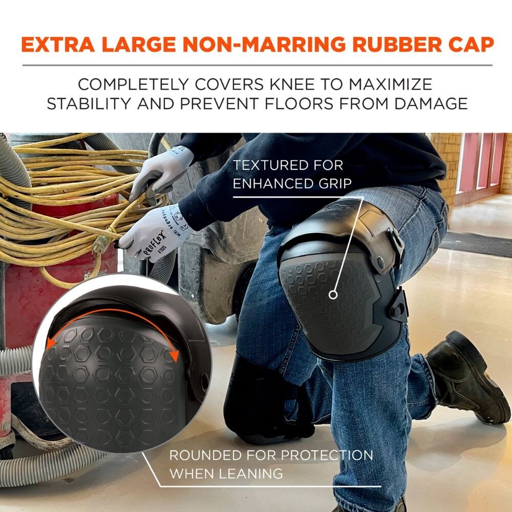 The ProFlex 360 Hard Shell Hinged Knee Pads feature an ergonomic hinge design that is built to keep protection comfortably in place whether walking, crawling or kneeling. The combination of a heavy-duty hard shell with a soft non-marring cap makes these pads versatile for protection on any indoor or outdoor surface—no matter how abrasive or delicate. Unlike other knee pads of this style on the market, the free-moving hinge design enables smooth and full 180-degree extension of the pad when straightening the knee. Thick closed-cell foam padding provides supportive all-day comfort, while the extra-large rubber cap maximizes surface area to increase stability and minimize risk of scratching or marking flooring such as tile or linoleum. Wide elastic straps easily adjust for a custom fit on a variety of leg sizes, and are designed to sit further apart on the thigh and calf to prevent uncomfortable binding.
