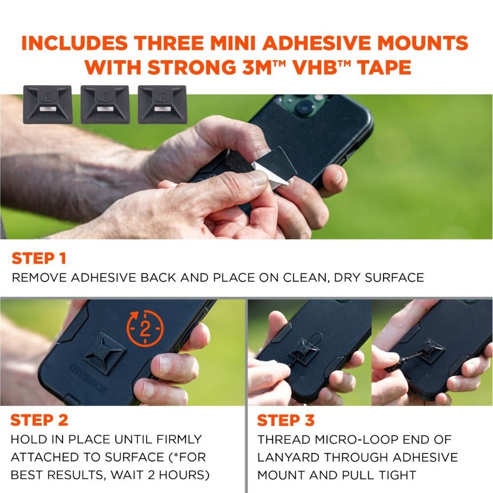 The Squids 3151 Coil Lanyard with Mini Adhesive Mounts features a swivel hook on one end, a low-profile detachable loop on the other and 3 double-sided mini adhesive mounts to safely tether devices and accessories up to 2lbs // 0.9kg. Using high-strength and double-sided 3M VHB tape, the mini adhesive mounts easily attach to items such as cell phones, cameras, hand tools and other accessories to keep them close and ready while also preventing drops. The swivel hook end rotates 360° degrees and features a thumb action lever with spring-loaded latch for quick and snag-free attachment to belt loops, clothing, bags or wrist mounts. The micro-loop end threads through the small captive holes of the included mini adhesive mounts, with a detachable modular buckle for quick exchange. The low-profile coil design stays out of the way to reduce snag or tangle hazards. This coiled lanyard is great for all types of everyday use, including worksites or weekend activities.