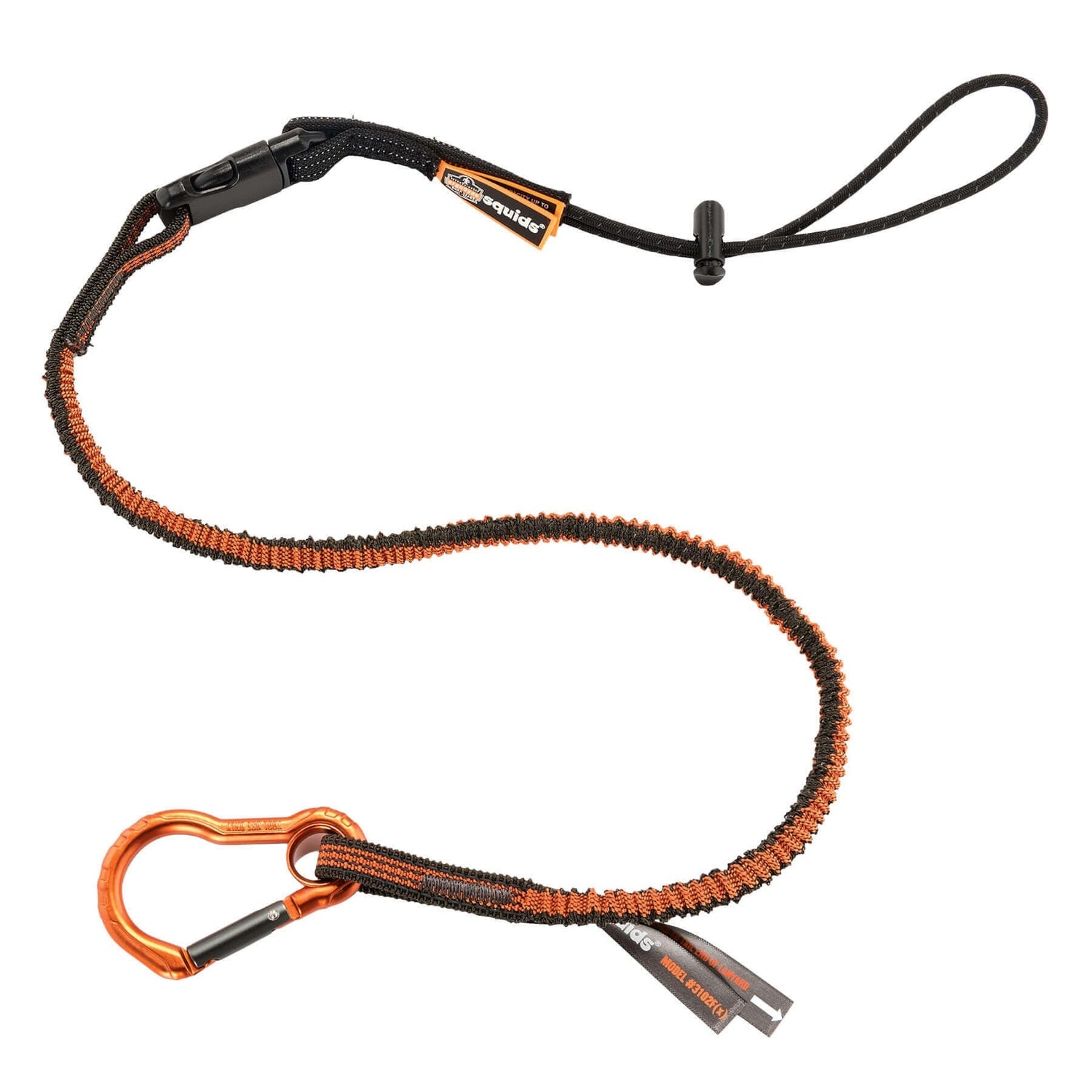 The Squids 3181 Tool Tethering Kit includes a 3102F(x) Detachable Single Carabiner Lanyard, a 12-foot roll (3.7m) of 3755 Self-Adhering Tape Trap, and three 3103 Detachable Elastic Tool Tails. This kit allows you to tether up to four 5lb (2.3kg) tools.