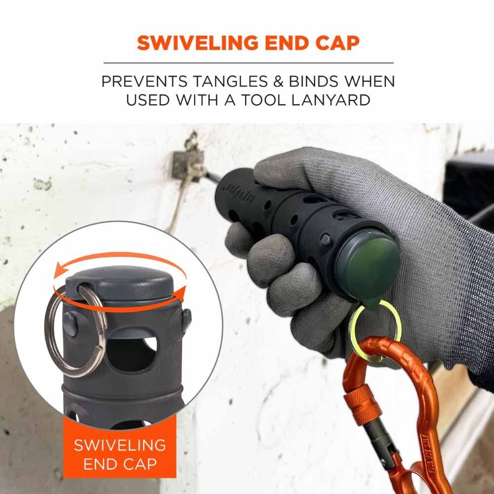 - SWIVELING END CAP - Features swiveling connection point for tethering and prevents tangles and binds when used with a tool lanyard