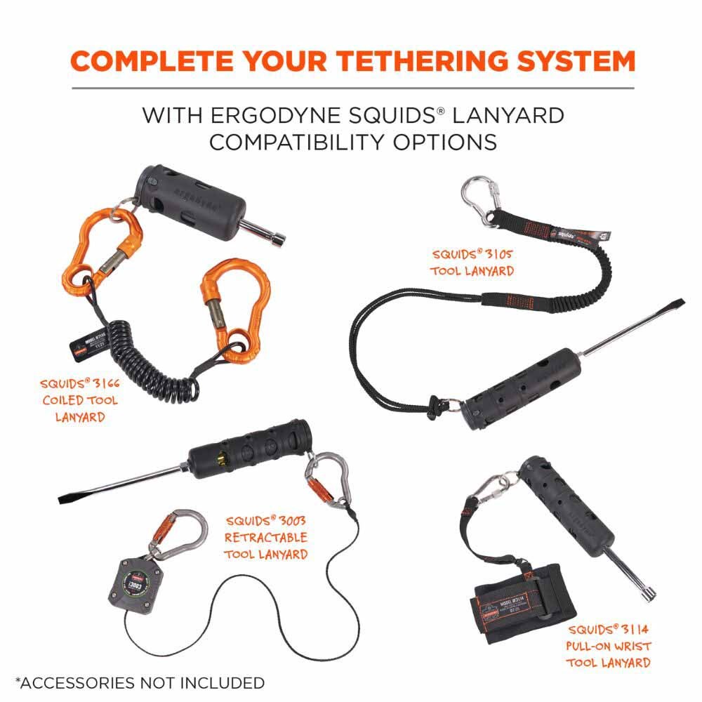 The Squids 3745 Tool Grip and Tether Attachment Point (2-pack) installs onto screwdrivers and nut drivers to create a retrofit attachment point for tethering tools up to 1lb // 0.45kg, preventing dropped or falling objects from occurring on the job. Connection points for tool lanyards can be tricky to find, especially on smaller hand tools like screwdrivers and nut drivers. While working at heights, it is important to tether tools as part of your overall fall protection plan, but the lack of these connection points can make that difficult. Designed in two pieces, this tool attachment features an end cap and a rubber sleeve. To install, slide a screwdriver or nut driver into the rubber sleeve and plug the end cap’s pegs into the reinforced holes of the rubber sleeve. The sleeve features a textured rubber and is ergonomically designed to cover the entire tool handle—providing greater comfort, torque and an enhanced grip.