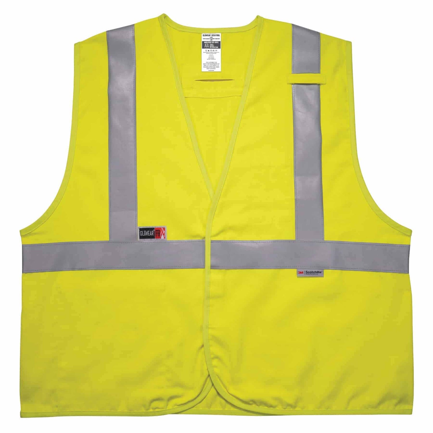 The GloWear 8261FRHL Hi-Vis FR Class 2 Safety Vest is dual FR-compliant to NFPA 2112 and NFPA 70E for protection against flash fire and arc flash hazards. Designed to be worn as part of a complete FR garment system, it is tested and certified to an ATPV 6.6 cal/cm2. FR & ANSI-COMPLIANT This flame-resistant safety vest is made with breathable, moisture-wicking and ANSI-compliant 5.5oz Westex by Milliken DH material for full protection from flash fire and arc flash. This reflective vest is a Type R Class 2 garment and features 2 3M Scotchlite FR reflective for heightened visibility at night or in low light environments. POCKETS & ACCESSORIES This work vest features two convenient interior pockets, one open top to fit cell phones, badges, etc. and one dual pen pocket. A single FR radio mic tab and FR hook & loop front closure designed for easy on/off. This FR high-visibility clothing is ideal PPE for petrochemical, electrical, oil & gas and refinery work.
