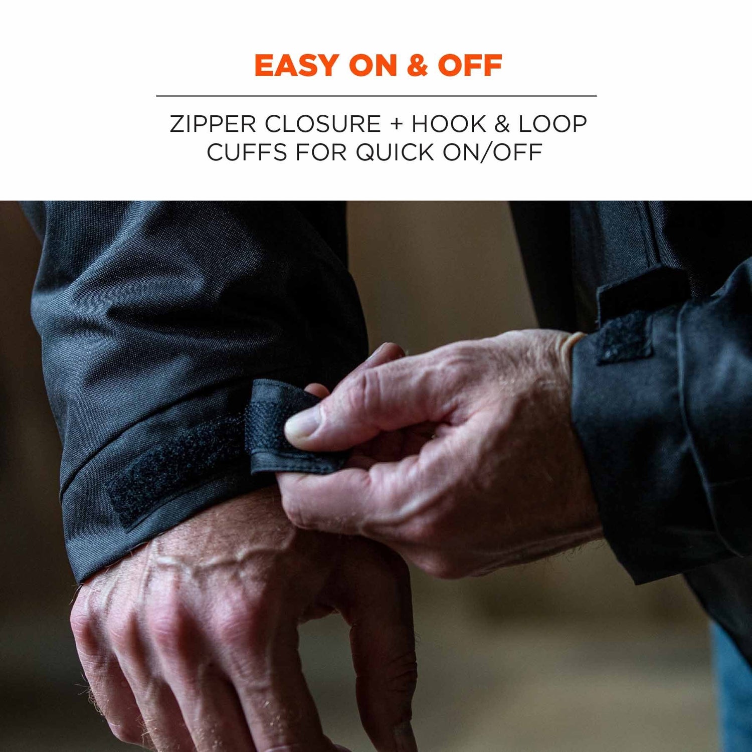 - EASY ON & OFF - Heavy-duty front zipper closure plus hook & loop cuffs for easy on/off with gloves