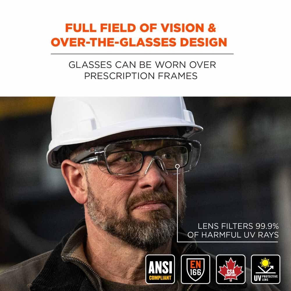 Skullerz OSMIN Safety Glasses feature an Over-the-Glasses (OTG) wrap-around lens for a wide field of vision and seamless fit over prescription frames. These safety glasses feature polycarbonate lenses to protect against impacts and filter 99.9 percent of harmful UVA, UVB and UVC rays. The frame features a nylon and soft rubber design for added durability and flexibility, while a molded-in brow guard and side shields provide enhanced protection from debris. Integrated brow venting enables airflow for all-day comfort. To provide a custom fit on a variety of faces, the rubber temples can be easily bent and re-bent for a custom, secure fit. Built-in soft rubber guards on the frame and temples protect prescription frames and lenses from constant movement and harmful scratching that can occur with some over-the-glass safety glasses.