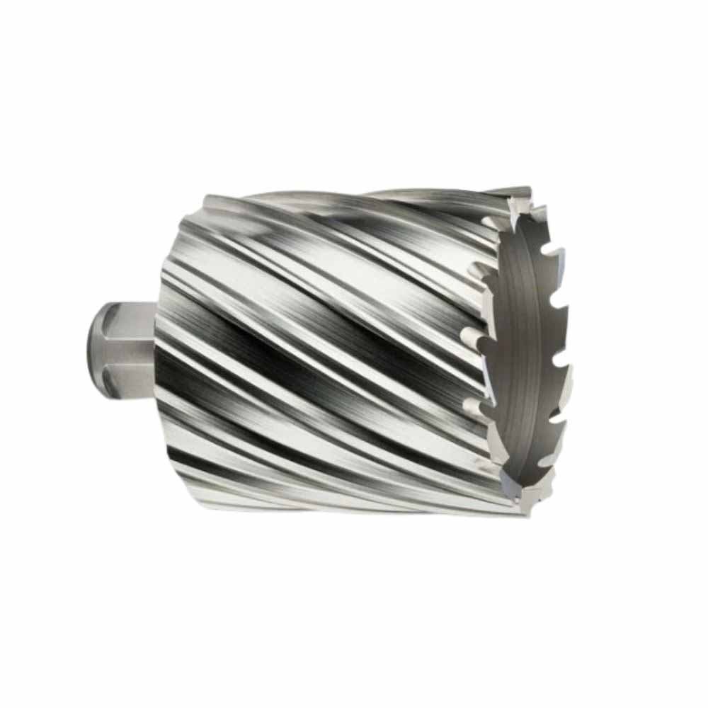 The Jancy Slugger uncoated, high-speed steel metric annular cutter with 1” depth and a 3/4” annular cutter shank is used to create metric-sized through holes as deep as 1” in a range of materials, with best performance in mild steel and structural steel. An annular cutter removes only the circumference of a through hole (extending through the workpiece), releasing the central material as a slug when the hole has been cut. The center-free design of the tool results in energy efficiency and reduced cycle time: the operator can produce holes three to five times faster than with a conventional twist drill that must convert the entire hole into chips. In addition, this tool’s multiple cutting edges can create an accurate, burr-free hole that minimizes the need for secondary operations such as pre-drilling and reaming.