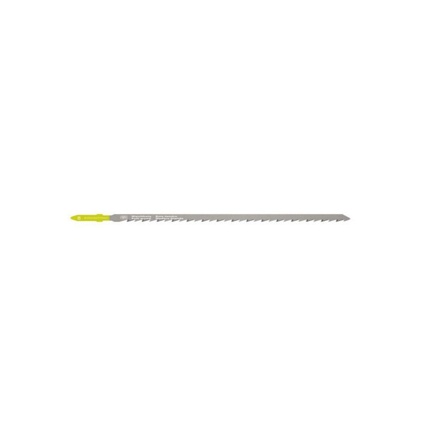 Profi-Line jigsaw blades designed for fast, straight cuts in wood materials including softwood, hardwood, OSB, plywood, MDF, and chipboard. Durable chrome-vanadium construction in a T-shank design (5 Pack).