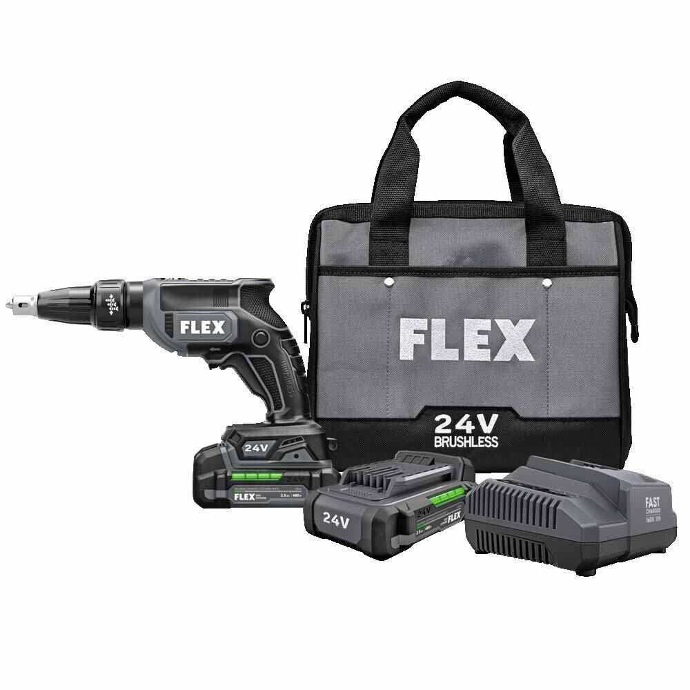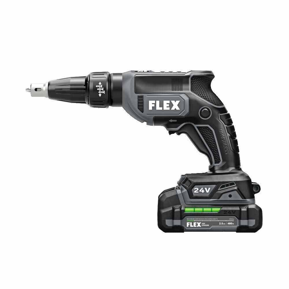 Hang sheet after sheet with ease with the FLEX 24V Drywall Screw Gun. This lightweight screw gun arms you with ultimate in speed and efficiency with maximum control. Lock-on mode delivers continuous power to secure drywall panels. Setup is easy with tool-free adjustments. The bright, built-in LED light illuminates dark spaces. This cordless drywall screw gun is compatible with the FLEX Magazine Attachment (FT161, sold separately) for increased productivity with collated screws. All this performance is built on the FLEX Advantage of unmatched battery power, runtime, and fast charging. The drywall screw gun kit includes the drywall screw gun, two 2.5Ah lithium batteries, and a 160W Fast Charger. It’s all protected by the FLEX Founders Limited Lifetime Warranty when registered within 30 days of purchase at registermyFLEX.com through December 31, 2023.