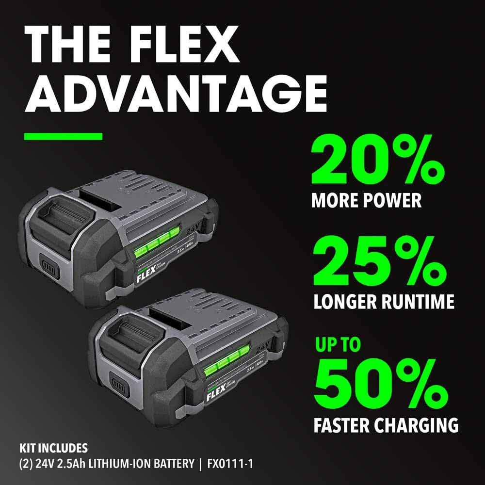- THE FLEX ADVANTAGE - 20% more power with 24V lithium, 25% longer runtime with THERMA-TECH™ heat management, up to 50% faster charging with high-power, dual fan chargers