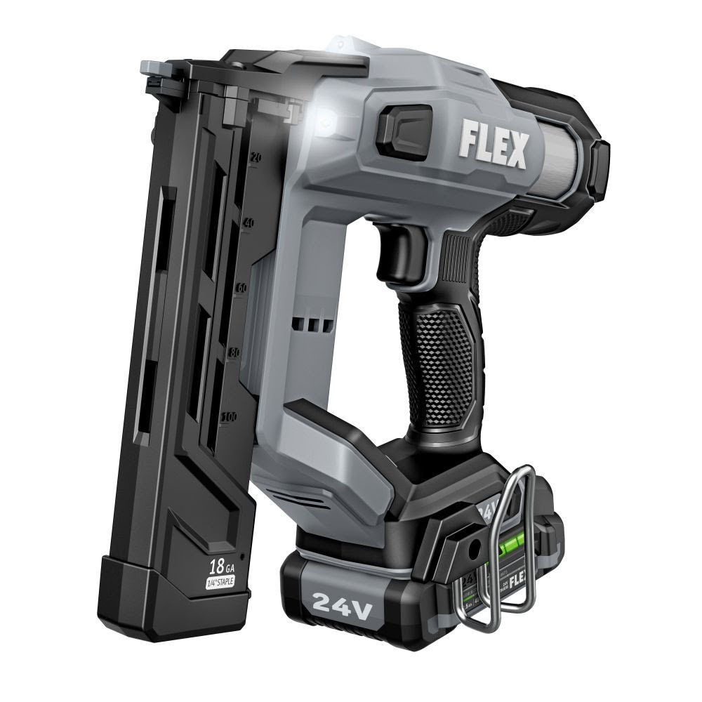 Power through subfloor installation and other jobs without the hassle of hoses and compressors with the FLEX 24V Brushless 18Ga 1/4” Narrow Crown Stapler. This cordless stapler delivers high-speed power by driving up to 3 staples per second with zero ramp up time. It drives up to 2,200 staples on a single charge with a 2.5Ah lithium-ion battery for extended runtime. The staple gun features an ergonomic quick depth adjustment lever to easily set the ideal depth when driving fasteners, and its triple LED worklight delivers better visibility in dark work areas. The cordless staple gun toggles between bump and sequential firing modes and has a staple indicator to easily see how many staples remain in the magazine. Dry-fire lockout avoids blank firing and damage to your work when the staple supply is exhausted. The cordless stapler is compact and lightweight to conquer tight spaces with minimal fatigue. Its belt clip can be mounted on either side of the tool and features a lead-in profile. The stapler accepts 1/4-inch crown size fasteners between 3/8-inch and 1-1/2-inches in length. This cordless stapler delivers the FLEX Advantage of unmatched battery power, runtime, and fast charging. Kit includes the 1/4-inch narrow crown stapler, 2.5Ah lithium battery, 160W Fast Charger, belt clip, (3) no-mar tips, and a FLEX bag. It’s all protected by the FLEX Limited Lifetime Warranty when registered within 30 days of purchase at registermyFLEX.com through December 31, 2024.