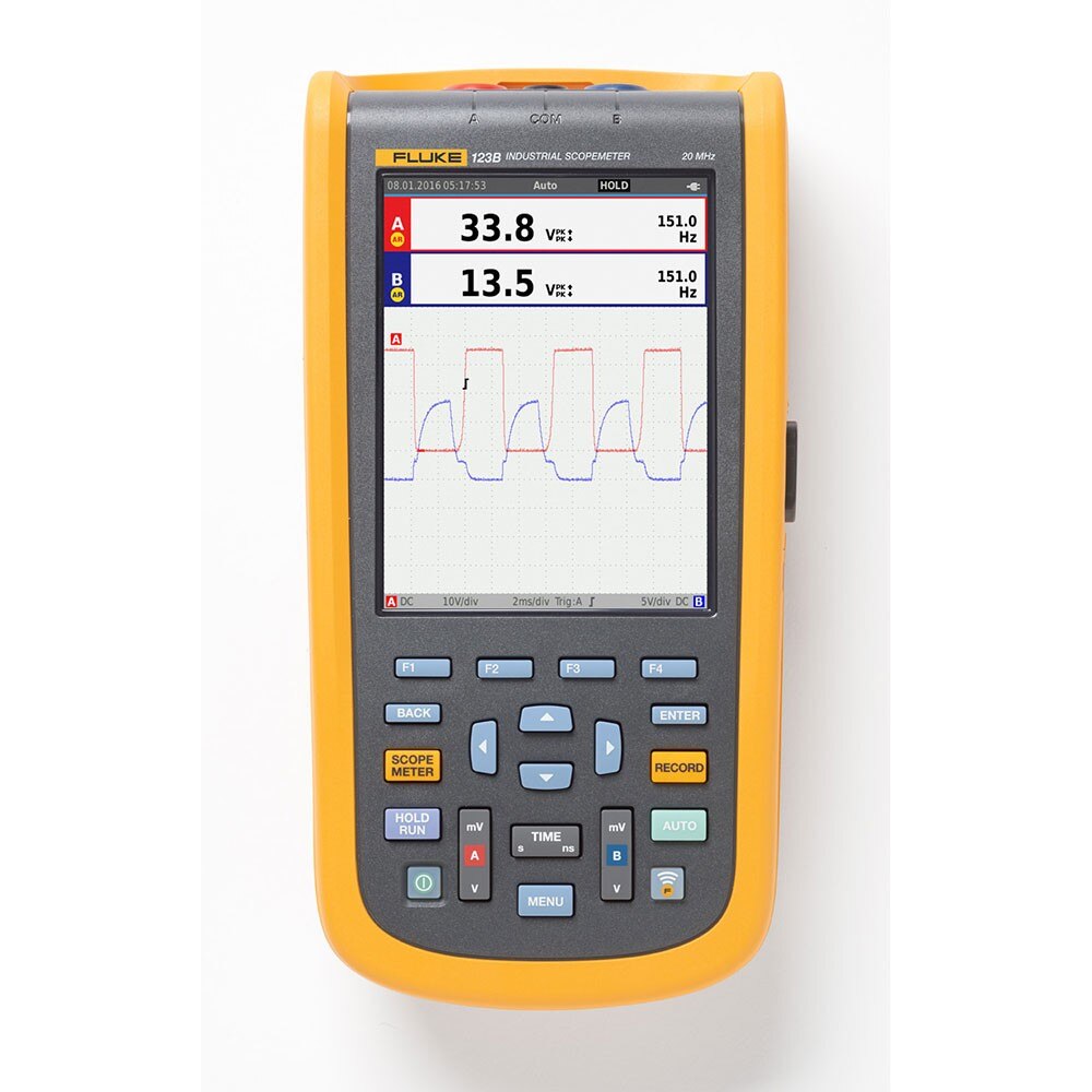 The Fluke 123BNA 20 MHz, 2-Channel, 40 MS/s Industrial ScopeMeter Hand-Held Oscilloscope with Fluke Connect Compatibility is the rugged oscilloscope solution for industrial electrical and electro-mechanical equipment troubleshooting and maintenance applications. It is a truly integrated test tool with oscilloscope, multimeter and high-speed recorder in one, easy-to-use instrument. The 123B/NA also integrates with Fluke Connect mobile app to enable further collaboration, data analysis and archiving of critical test information. The Fluke 123B/NA includes innovative functions designed to help technicians troubleshoot faster and get the answers they need to keep their systems up and running. Display waveforms with Connect and View trigger and setup technology and automatically view related numerical measurements using Fluke IntellaSet technology, all without making manual measurement adjustments. With Recorder Event Detect capabilities, elusive intermittent events are captured and logged for easy viewing and analysis.