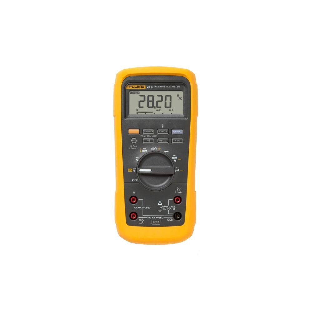 The Fluke 28 II digital multimeters define the standard for operating in harsh conditions with the features and accuracy to troubleshoot most electrical problems. Both meters have IP 67 (waterproof and dustproof) rating, MSHA approvals, extended operating temperature range of -15 °C to +55 °C (5 °F to 131 °F, -40 °C for up to 20 minutes) and 95% humidity, and have been designed and tested to withstand a 3 m (10 ft) drop. The Fluke 20 Series Multimeters are built to work in the toughest environments.